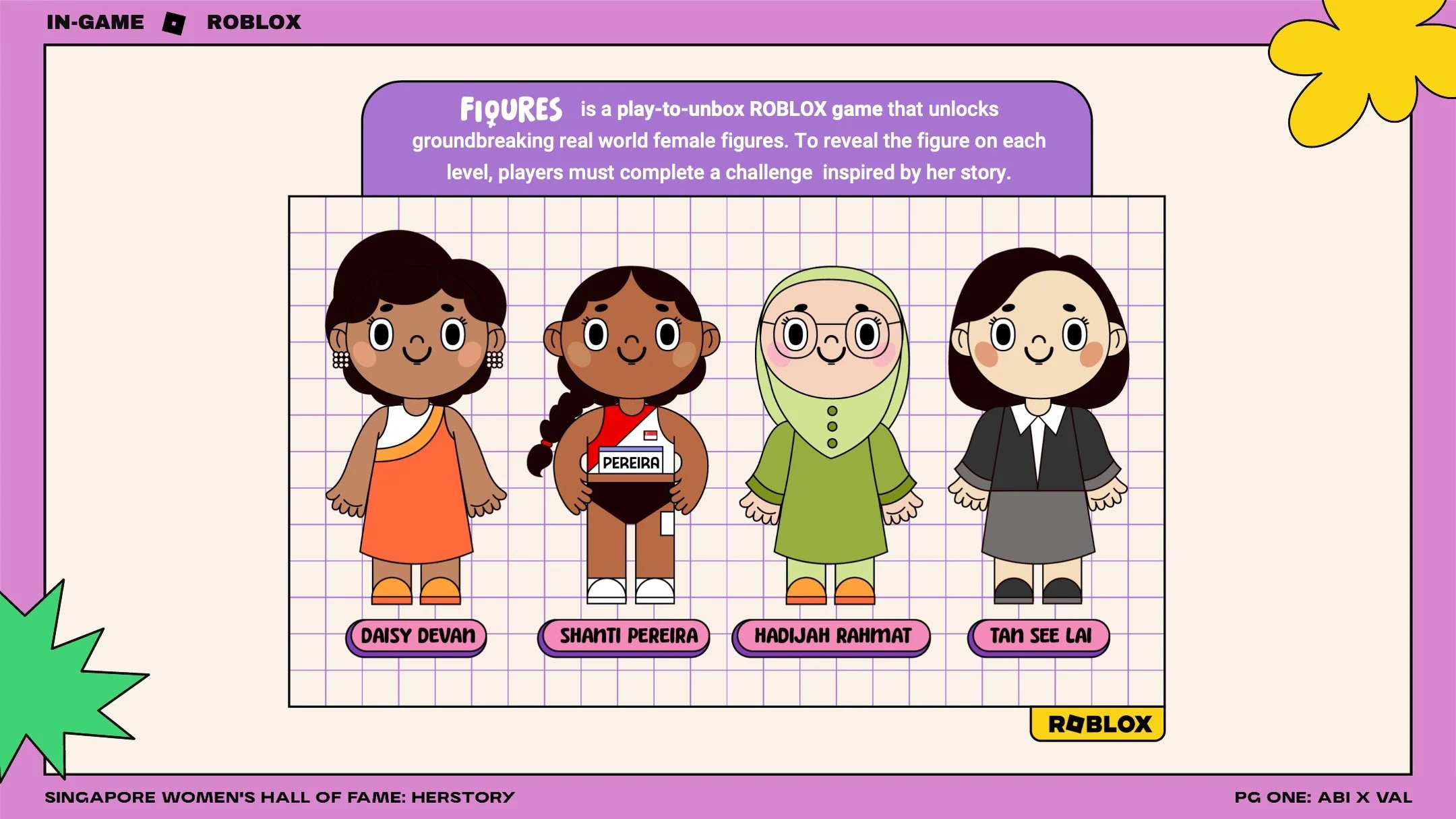 Figures is a play-to-unbox ROBLOX game that unlocks groundbreaking real world female figures. To reveal the figure on each level, players must complete a challenge  inspired by her story.